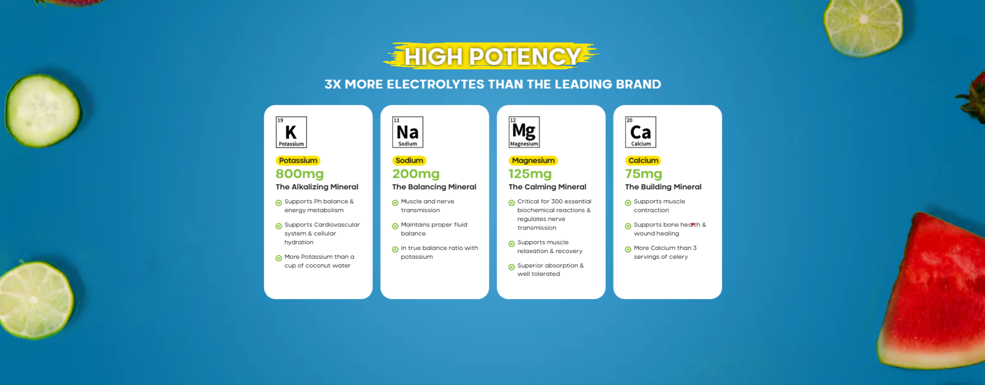 Real Electrolytes delivers 2000mg of Real Food from Coconut Water Powder, Celery Juice Powder, and Cucumber Juice Powder, while guaranteeing potency through Potassium Citrate, Magnesium Glycinate, Calcium Ascorbate, and real salt. We use only natural sweetness from Stevia and Monk Fruit, natural flavors and colors.