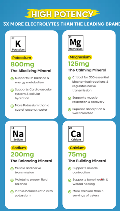 Electrolytes regulate hydration through fluid balance in the body (both inside and outside of cells), while also regulating nervous system transmission, cardiovascular health, bone density, sleep quality, and muscle performance. If you do not consume enough electrolytes any one of these systems may suffer and dehydration alone can cause dramatic negative health consequences.